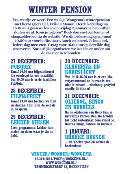 Yes, we zijn er weer! Een weekje Wongema’s Winterpension met herbergiers Eef, Erik en Manon. Derde Kerstdag om 16.00 gaan we los en op vrijdag 1 januari na het ontbijt sluiten we af.