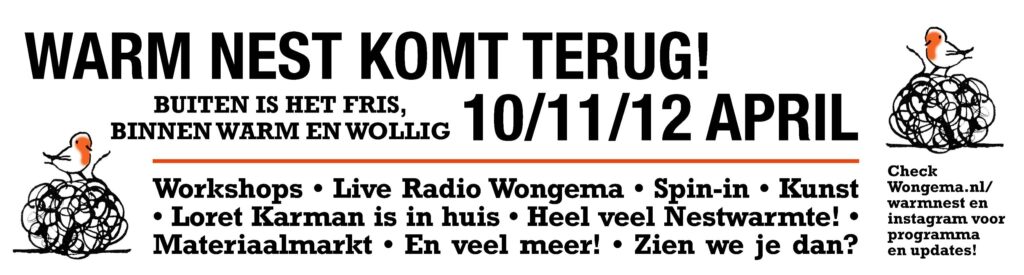 Warm nest is terug! Loret Karman geeft in het weekend van 10/11/12 april een workshop voor 20 deelnemers in de schuur van Wongema. We grijpen haar aanwezigheid aan om van dit weekend een volwaardig Warm Nest te maken. Samen met Nestwarmte, dat elke maand in het café samenkomt.